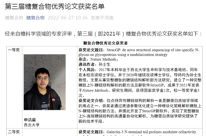 第三届全国糖复合物优秀论文奖 (2022年, 博士生申洁晨, 一等奖 1/1)