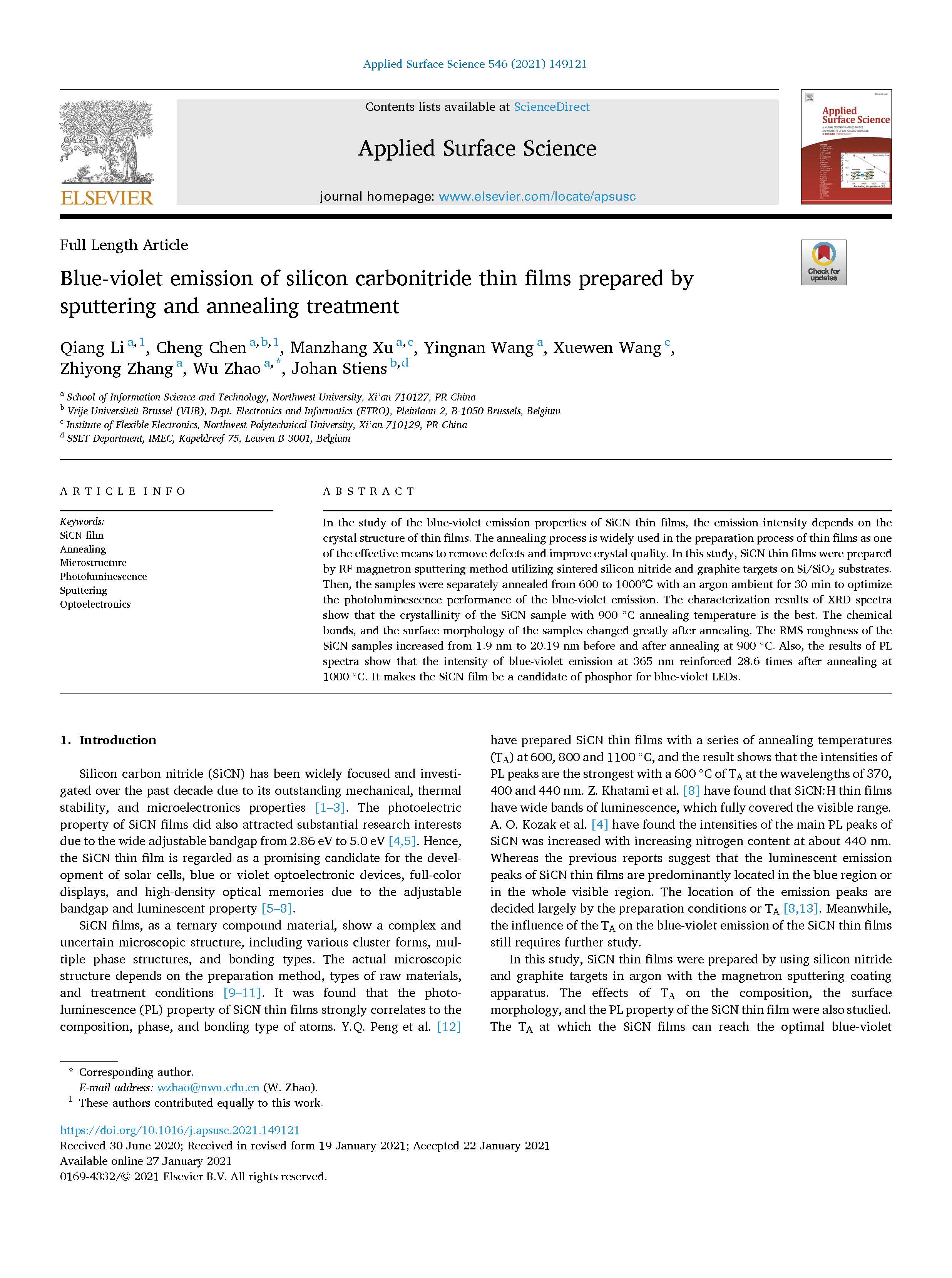 Key Words:SiCN film;Annealing;Microstructure;Photoluminescence;Sputtering;Optoelectronics